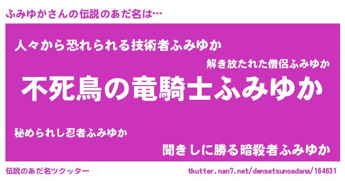 | 女子向けラノベタイトル風あだ名 | 『ふみゆか姫と円卓の騎士』 |