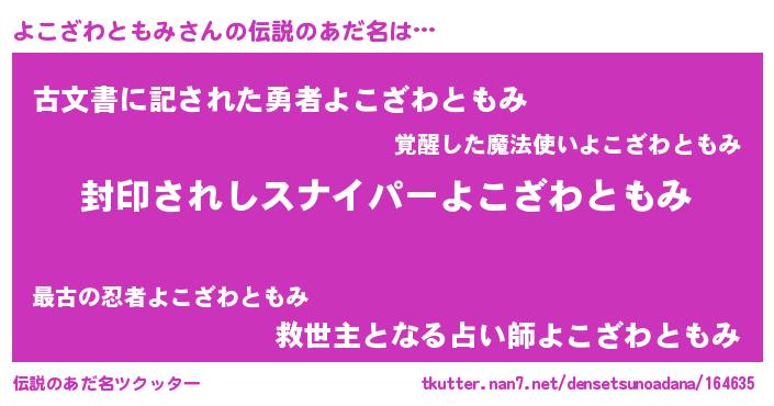 | ヘコむあだ名 | 『よこもー』『よこざわともみ(震え声)』 |