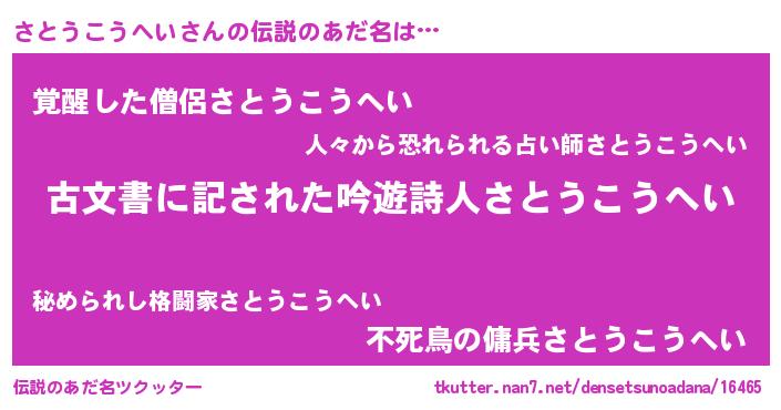 | 意味不明あだ名 | 『住所不定無職さとうこうへい(11歳)』 |