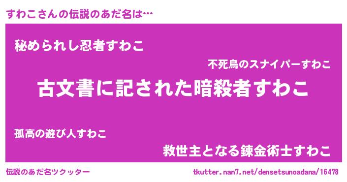 | 男性向けラノベタイトル風あだ名 | 『すわこ~年齢イコール彼女いない歴の魔法使い~』 |