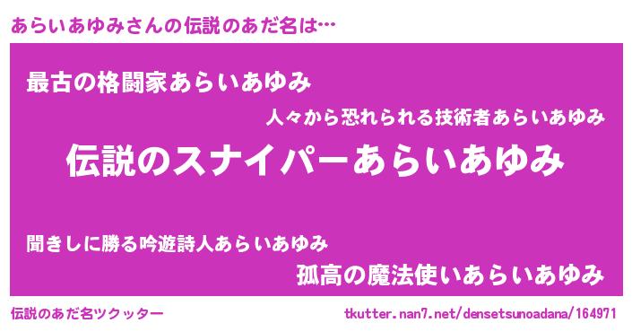 | ヒーロー風カッコイイあだ名 | 『スーパーアライアユミ』『暗黒騎士アラ』 |