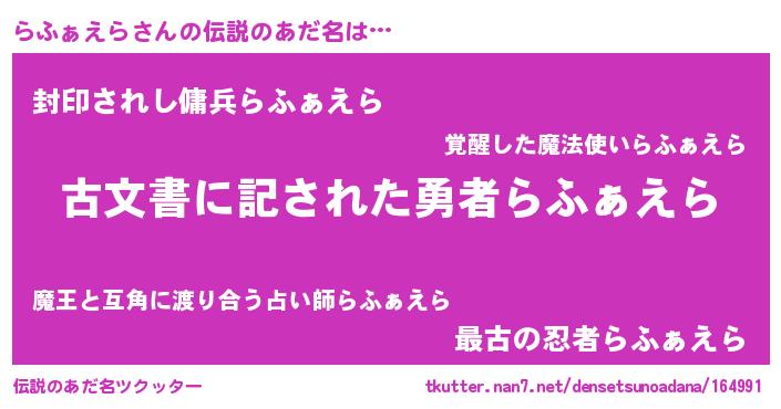 | 男性向けラノベタイトル風あだ名 | 『この素晴らしい世界にらふぁえらを!』 |