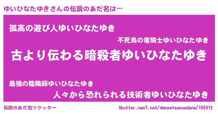 | ポケモン風あだ名 | 『ゼニユイ』『ヒユイヒナタユキ』 |
