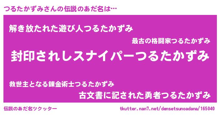 | 男性向けラノベタイトル風あだ名 | 『うちのつるたかずみが世界を掌握している!』 |