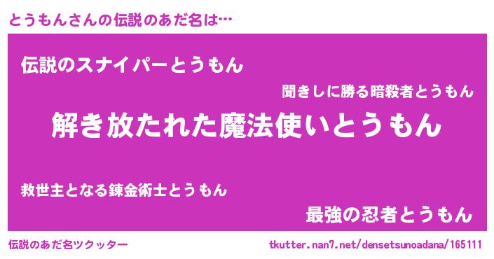 | 意味不明あだ名 | 『自称とうもん』『ペロリンとうもん』 |