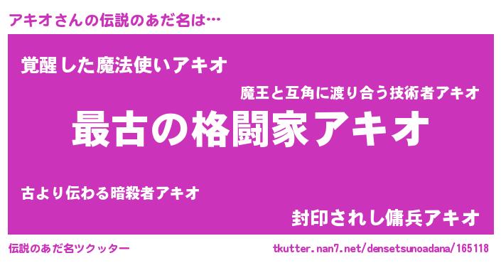 | 男性向けラノベタイトル風あだ名 | 『やはりアキオの青春ラブコメはまちがっている 』 |