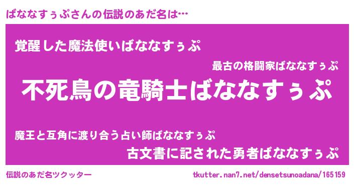 | 男性向けラノベタイトル風あだ名 | 『ばななすぅぷに滅ぼされるだけの簡単なお仕事です』 |