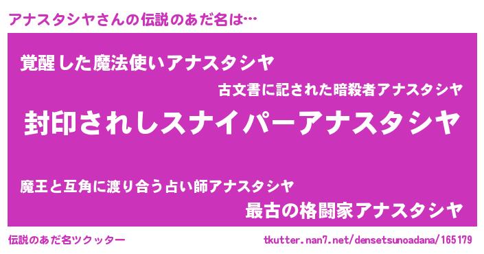 | ヒーロー風カッコイイあだ名 | 『仮面アナダー』『スーパーアナスタシヤ』 |