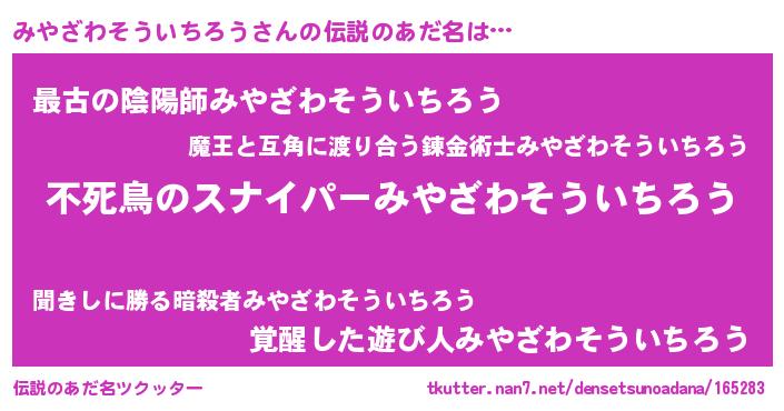 | 胡散臭い通販商品みたいなあだ名 | 『モテモテ間違いなし霊験あらたかなお札…その名も「みやざわそういちろう」』 |