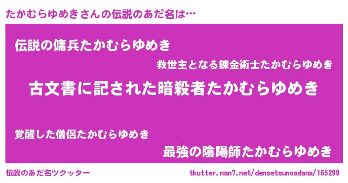 | 男性向けラノベタイトル風あだ名 | 『たかむらゆめきに滅ぼされるだけの簡単なお仕事です』 |