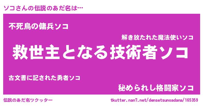 | ヒーロー風カッコイイあだ名 | 『慈愛の使者ソコ』『スーパーソコ』 |