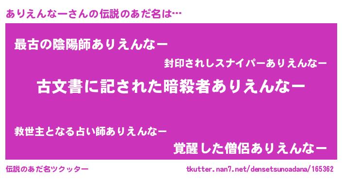 | 男性向けラノベタイトル風あだ名 | 『Re:ありえんなーから始める異世界生活』 |