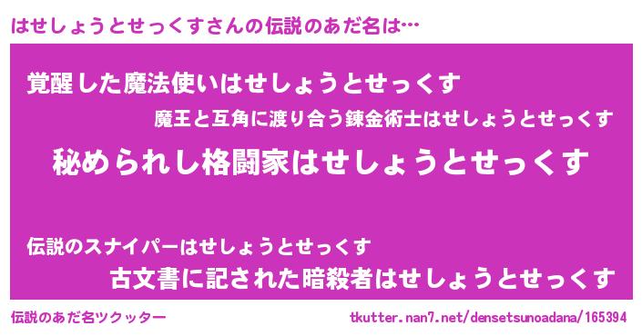 | ヒーロー風カッコイイあだ名 | 『ウルトラ戦士ハセショウトセックス』 |