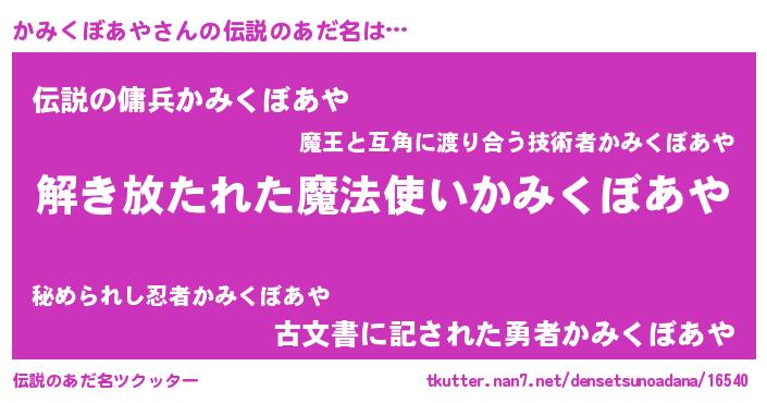 | ヒーロー風カッコイイあだ名 | 『幻影騎士カミ』『スーパーカミクボアヤ』 |