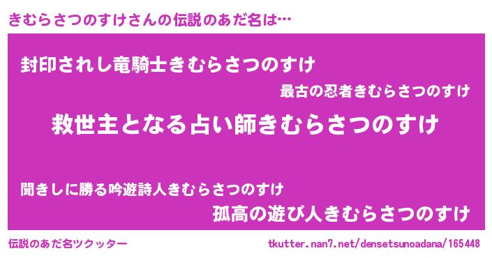 | 男性向けラノベタイトル風あだ名 | 『きむらさつのすけ~年齢イコール彼女いない歴の魔法使い~』 |