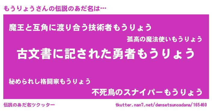 | 意味不明あだ名 | 『永久保存もうりょう』『自称もうりょう』 |