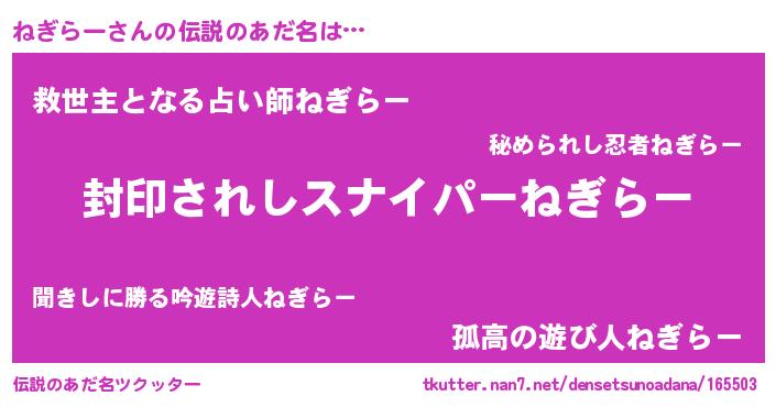 | 男性向けラノベタイトル風あだ名 | 『ネギラーアートオンライン』 |