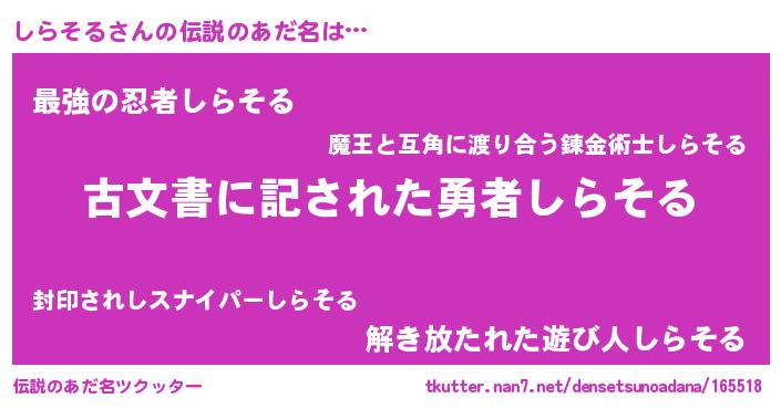 | 意味不明あだ名 | 『永久保存しらそる』『自称しらそる』 |