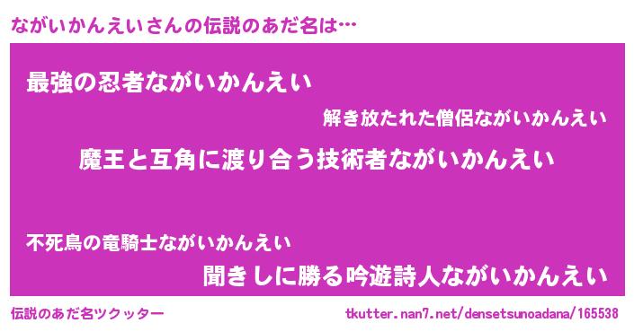 | 男性向けラノベタイトル風あだ名 | 『転生したらながいかんえいだった件』 |