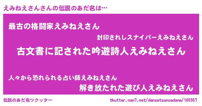 | ヒーロー風カッコイイあだ名 | 『ネオエミネエサン』『魔戒騎士エミ』 |