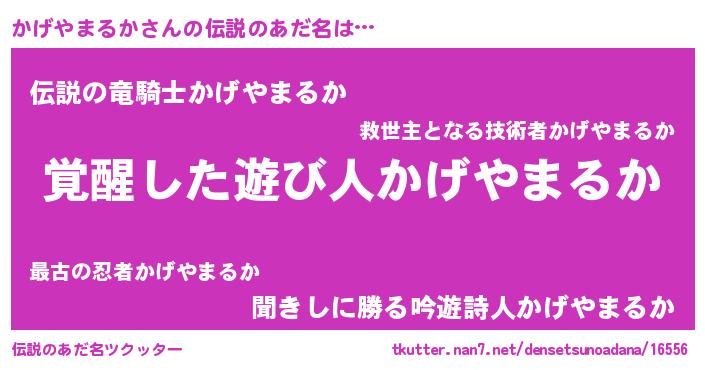 | 男性向けラノベタイトル風あだ名 | 『かげやまるかの嫁は女の子じゃないと思った?』 |