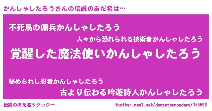 | 男性向けラノベタイトル風あだ名 | 『かんしゃしたろうの嫁は女の子じゃないと思った?』 |