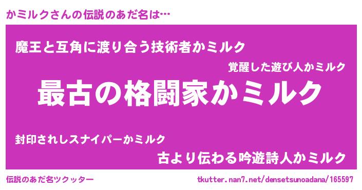 | 意味不明あだ名 | 『かミルクフォーエバー』『自称かミルク』 |