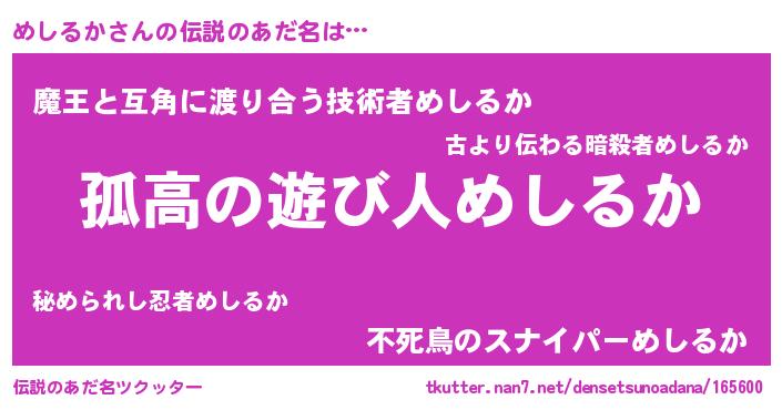 | 意味不明あだ名 | 『とにかく怪しいめしるか』 |