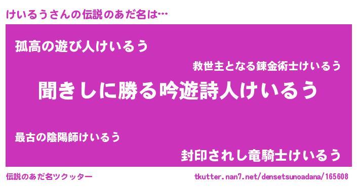 | 意味不明あだ名 | 『永久保存けいるう』『ペロリンけいるう』 |