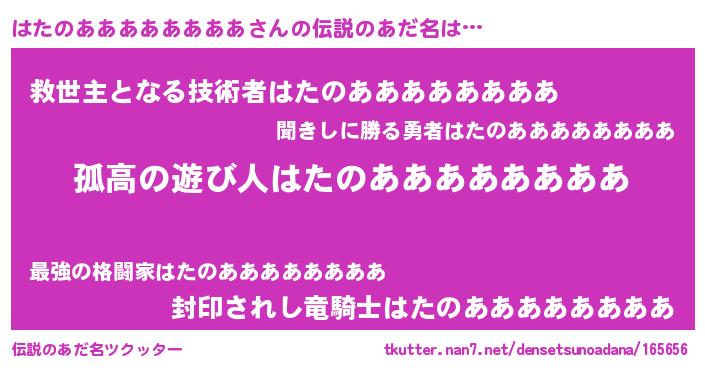 | 男性向けラノベタイトル風あだ名 | 『魔弾の王とはたのああああああああ』 |