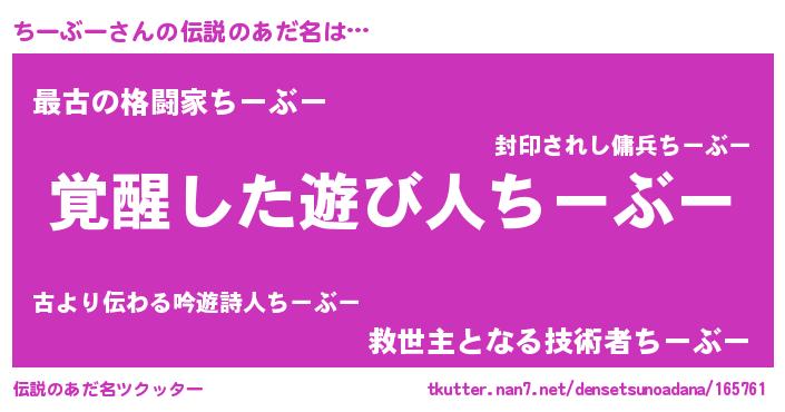 | 男性向けラノベタイトル風あだ名 | 『ちーぶー~年齢イコール彼女いない歴の魔法使い~』 |