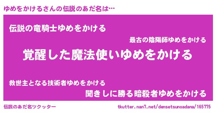 | ヒーロー風カッコイイあだ名 | 『天弓騎士ユメ』『スーパーユメヲカケル』 |