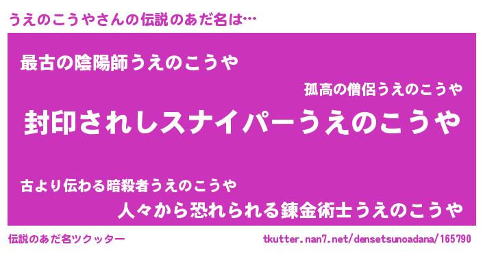| 男性向けラノベタイトル風あだ名 | 『ウエノコウヤアートオンライン』 |