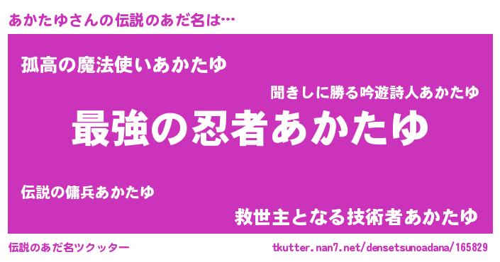 | 男性向けラノベタイトル風あだ名 | 『うちのあかたゆが世界を掌握している!』 |