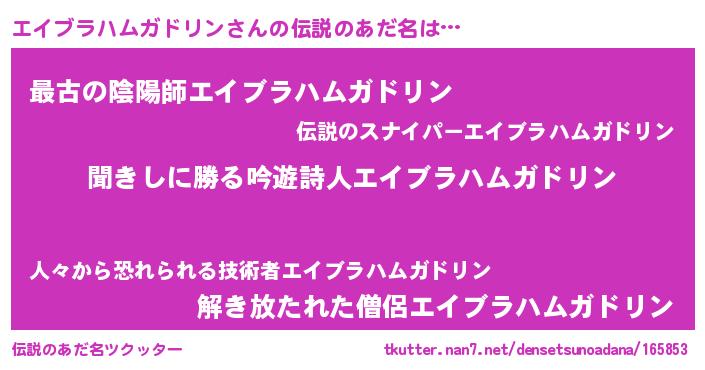 | 意味不明あだ名 | 『住所不定無職エイブラハムガドリン(13歳)』 |