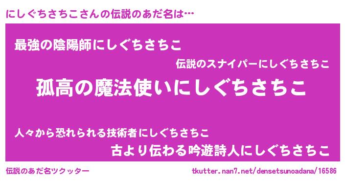 | 男性向けラノベタイトル風あだ名 | 『魔弾の王とにしぐちさちこ』 |