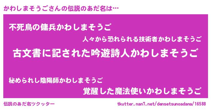 | ヘコむあだ名 | 『かわしまそうご(小並感)』『かわにゅー』 |