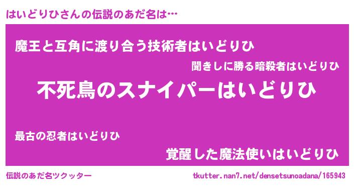 | 男性向けラノベタイトル風あだ名 | 『転生したらはいどりひだった件』 |