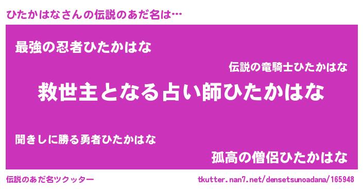 | ヒーロー風カッコイイあだ名 | 『究極戦士ヒタカハナ』『黄金騎士ヒタ』 |