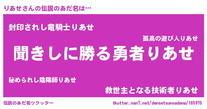 | 男性向けラノベタイトル風あだ名 | 『りあせという概念が存在しない退屈な世界 』 |