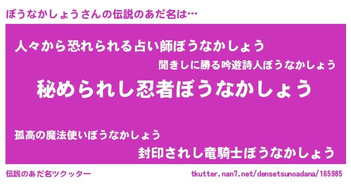 | 男性向けラノベタイトル風あだ名 | 『ボウナカショウスレイヤー』 |