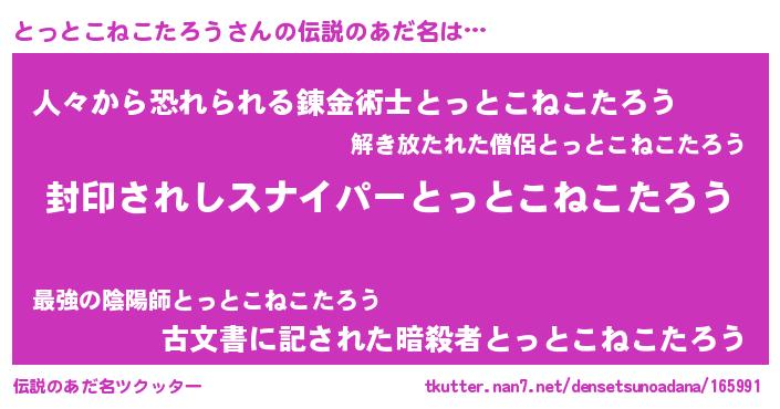 | 男性向けラノベタイトル風あだ名 | 『トットコネコタロウアートオンライン』 |