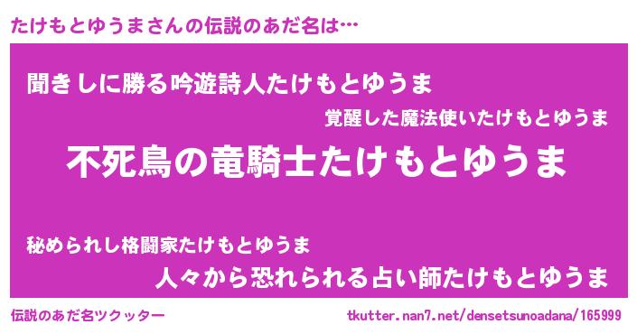| 女子向けラノベタイトル風あだ名 | 『たけもとゆうま姫と円卓の騎士』 |