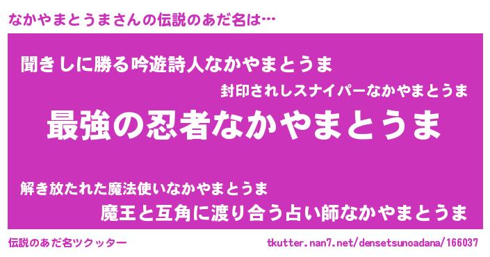 | 男性向けラノベタイトル風あだ名 | 『Re:なかやまとうまから始める異世界生活』 |