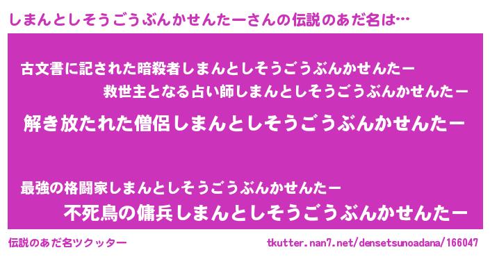| 意味不明あだ名 | 『とにかく怪しいしまんとしそうごうぶんかせんたー』 |