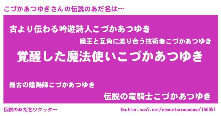 | ヒーロー風カッコイイあだ名 | 『炎刃騎士コヅ』『ネオコヅカアツユキ』 |