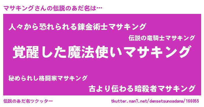 | 男性向けラノベタイトル風あだ名 | 『マサキングの嫁は女の子じゃないと思った?』 |