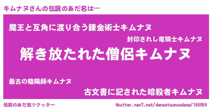 | 男性向けラノベタイトル風あだ名 | 『キムナヌの嫁は女の子じゃないと思った?』 |