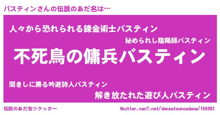 | 女子向けラノベタイトル風あだ名 | 『乙女ゲームの破滅フラグしかない悪役バスティンに転生してしまった…』 |