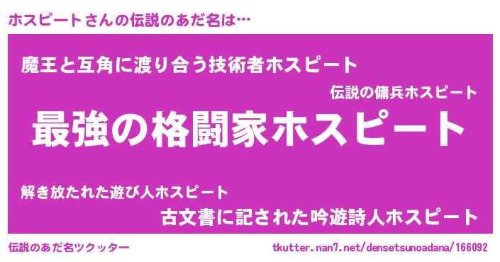 | 男性向けラノベタイトル風あだ名 | 『ホスピートに滅ぼされるだけの簡単なお仕事です』 |
